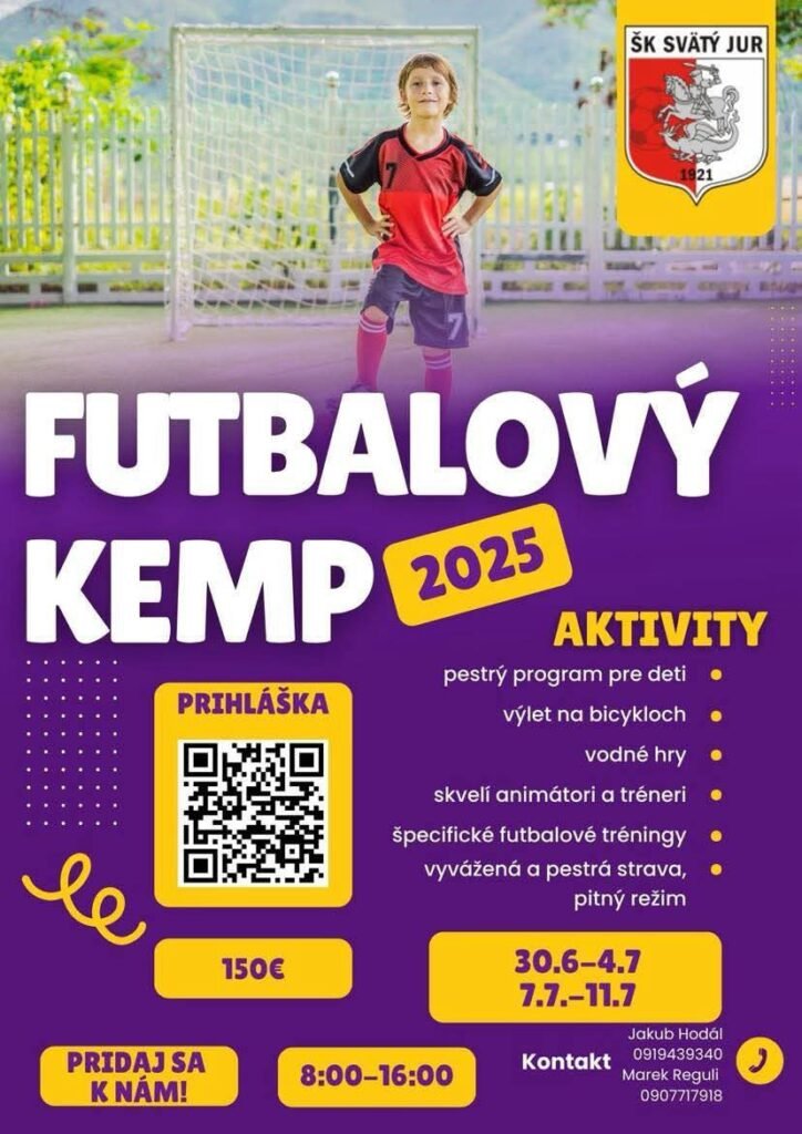 ŠK Svätý Jur organizuje Futbalový kemp 2025, ktorý ponúka deťom nezabudnuteľný týždeň plný futbalu, hier a zábavy! Pridajte sa a zažite skvelé letné dni so športom a novými kamarátmi. ✨ Termíny kempu ⚽ 30.6. – 4.7. 2025 ⚽ 7.7. – 11.7. 2025 🎡 Aktivity Pestrý program pre deti Výlet na bicykloch Vodné hry Skvelí animátori […]